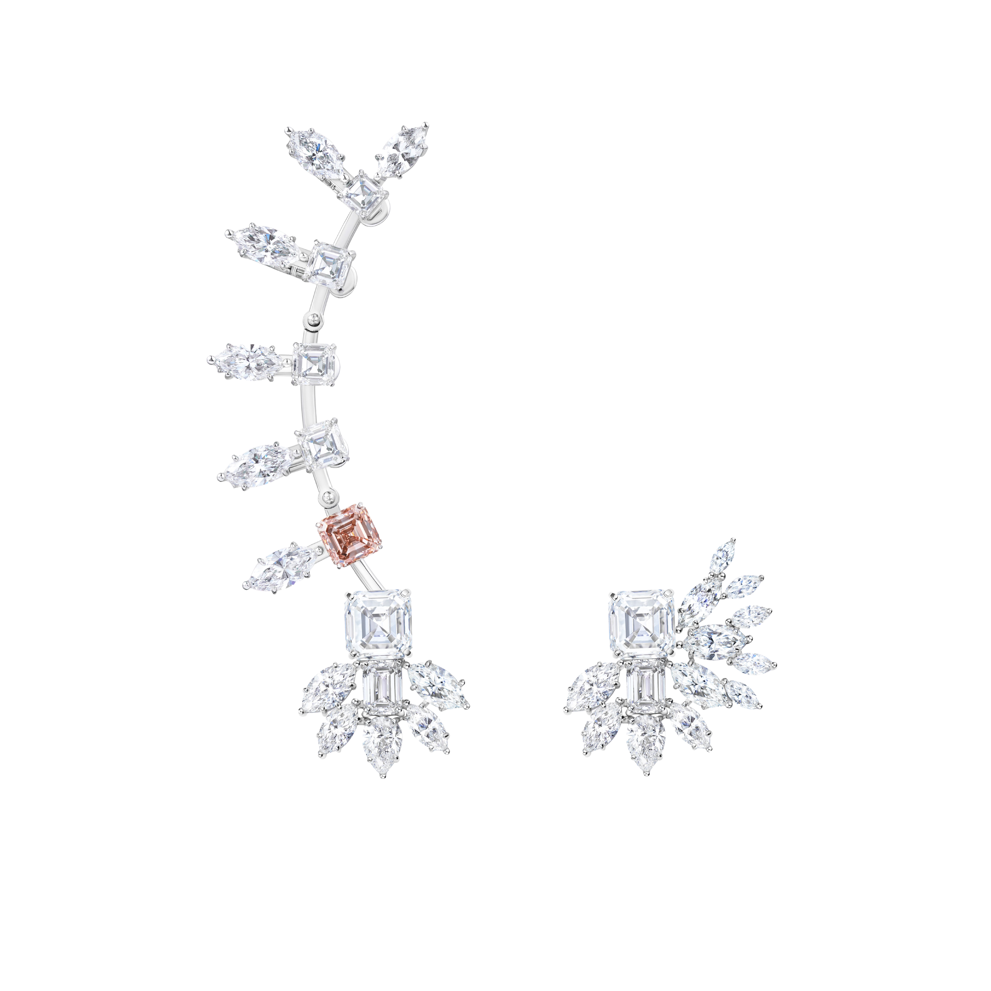 Precious metal: 18k White Gold Stone: LG Pink Diamond Carat Total Weight : 1.01ct Shape: Asscher Stone: LG Diamond Carat total weight: 15.22 ct Color/Clarity: F+/VS1+ Shape: Asscher, Marquise, Emerald, Pear Length: Right 3 cm / 1.18 in Length:left 0.9cm / 0.3 in Back: Push