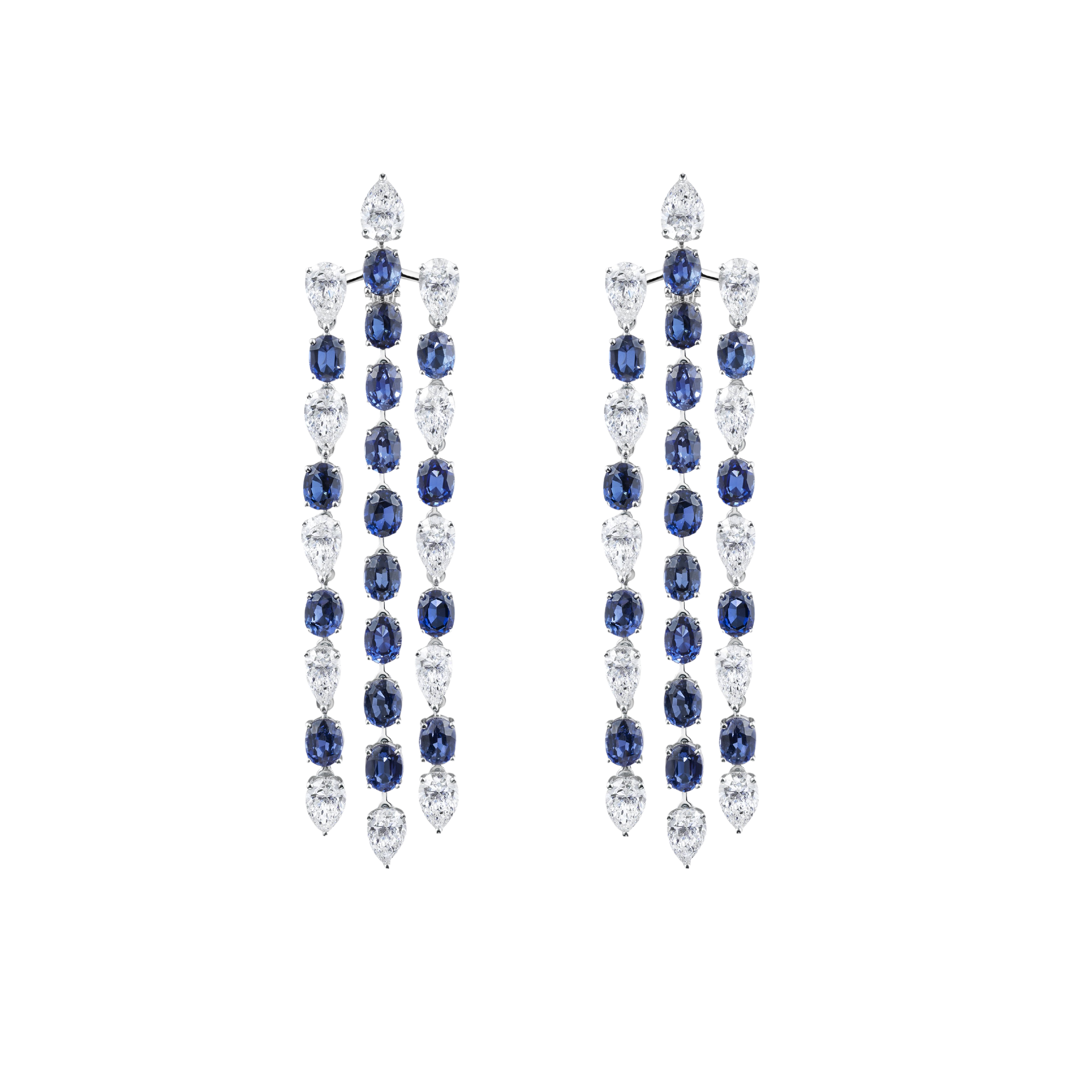 Precious Metal: 18k White Gold Stone: LG Diamonds, Recrystallized Sapphires Carat Total Weight: 29.812 Color/Clarity: F+/VS1+ Stone Shape(s): Oval, Pear Length: 7.5 cm / 2.95 in Back: Omega