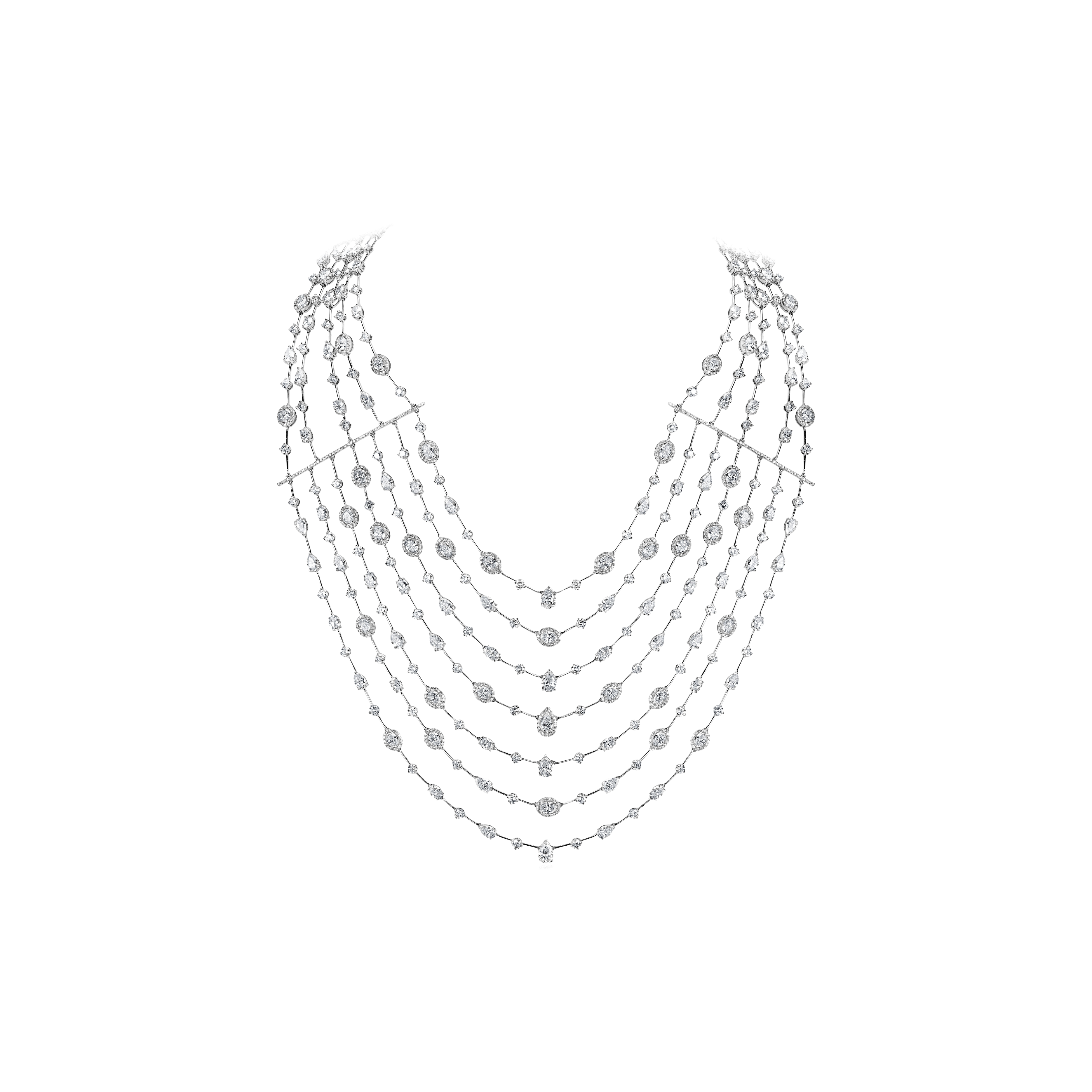 Precious Metal: 18k White Gold Stone: LG Diamond Carat Total Weight: 52,548 Color/Clarity : F+/ VS1+ Shape: Round, Oval, Pear Length: 58 cm / 22.83 In Back: Push Button Clasp
