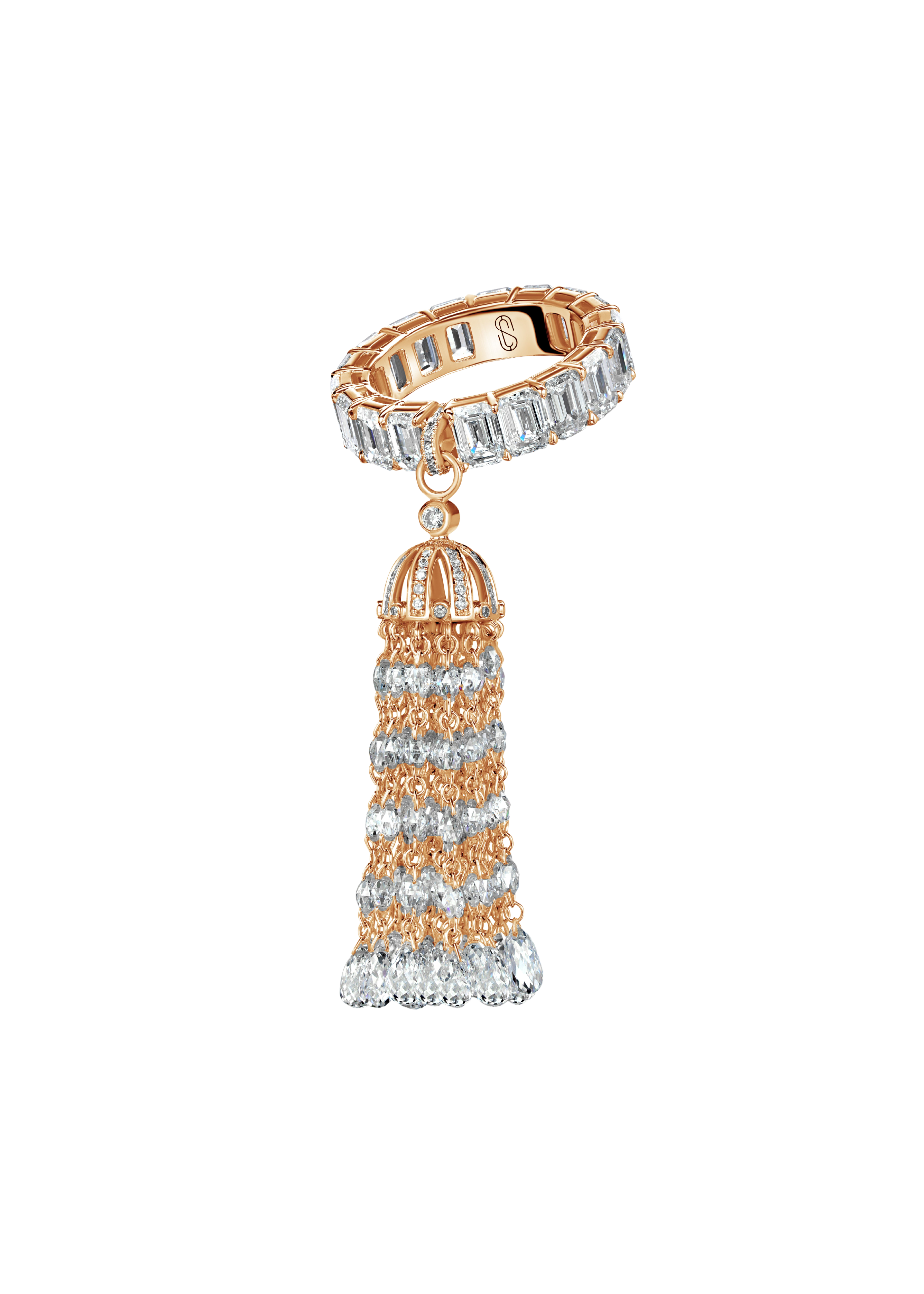 Ring Size: 4.0 Precious Metal: 18k Pink Gold Stone: LG Diamonds Carat Total Weight: 15.215 Color/Clarity: F+/VS1+ Stone Shape(s): Emerald/Briolette/Round Band Style: Pinkie Drop Ring