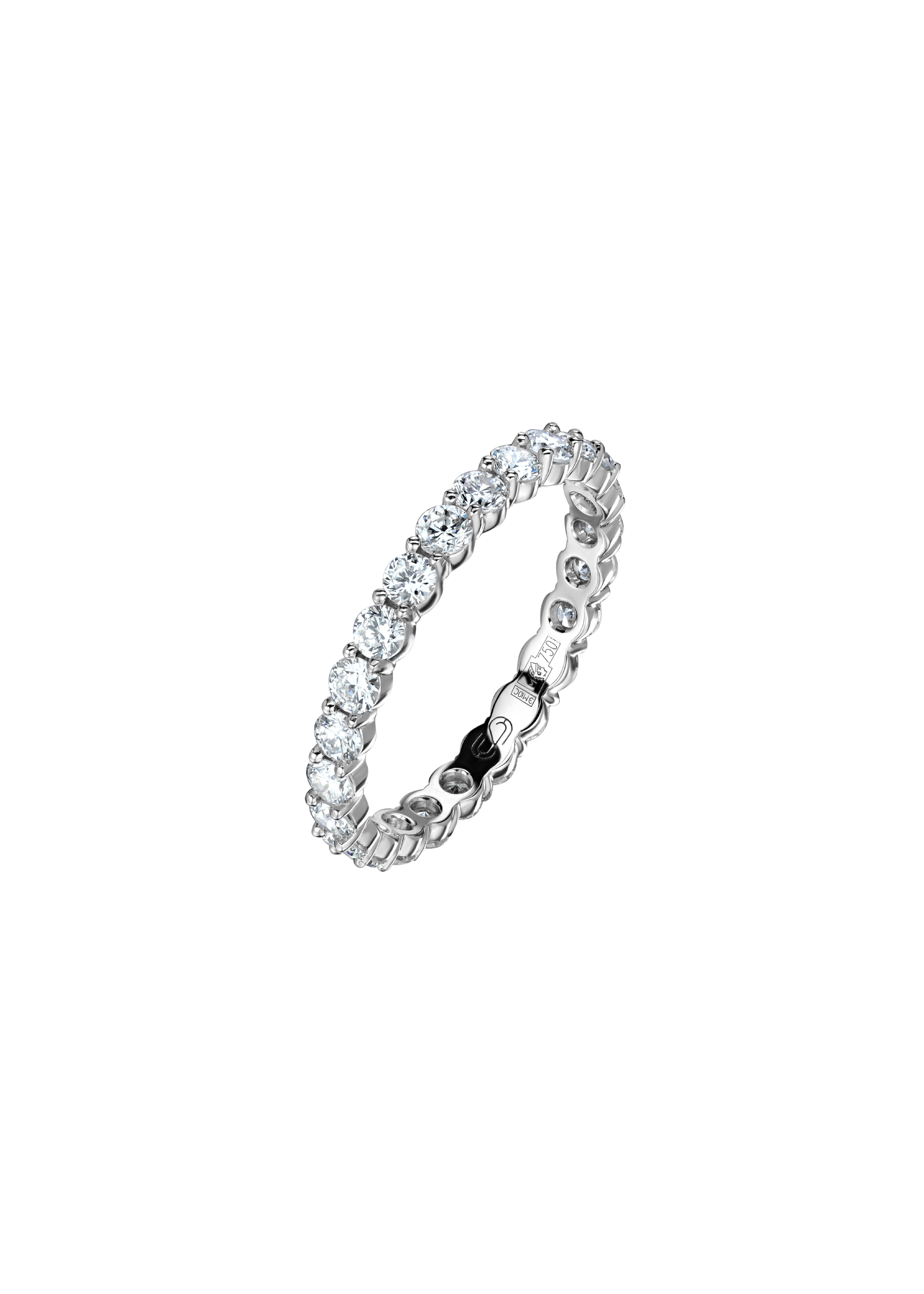Ring Size: 5.5 Precious Metal: 18k White Gold Stone: LG Diamond Carat Total Weight: 1.18 Color/Clarity: F+/VS1+ Stone Shape(s): Round Band Style: One Row Eternity