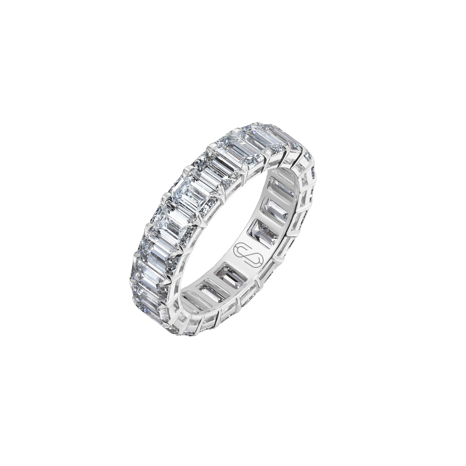Ring Size: 7.0 Precious Metal: 18k White Gold Stone: L/G Diamond Carat Total Weight: 7.870 Color/Clarity: F+/VS1+ Stone Shape(s): Emerald Band Style: One Row Eternity