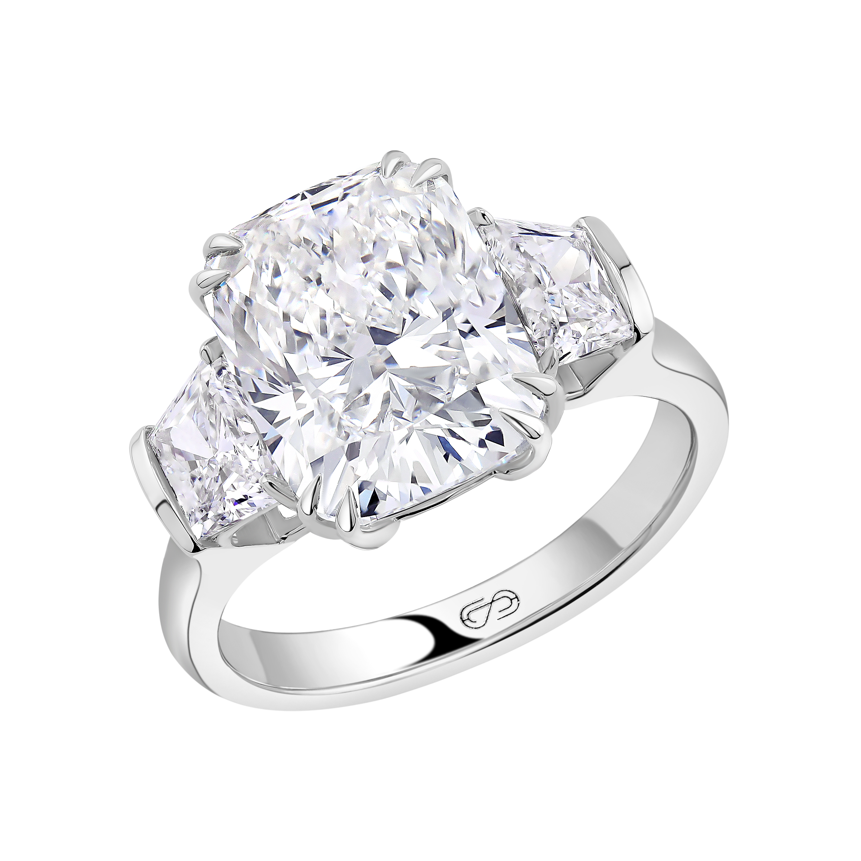 Ring Size: 7.0 Precious Metal: 18k White Gold Carat Weight Central: 5.15 Certificate: IGI Carat Weight Side Stones: 0.98 Stone: LG Diamond Diamond Color/Clarity: F+/VVS2+ Stone Shape(s): Cushion Center Side Stone Shape: Trapezoid Band Style: High Polish