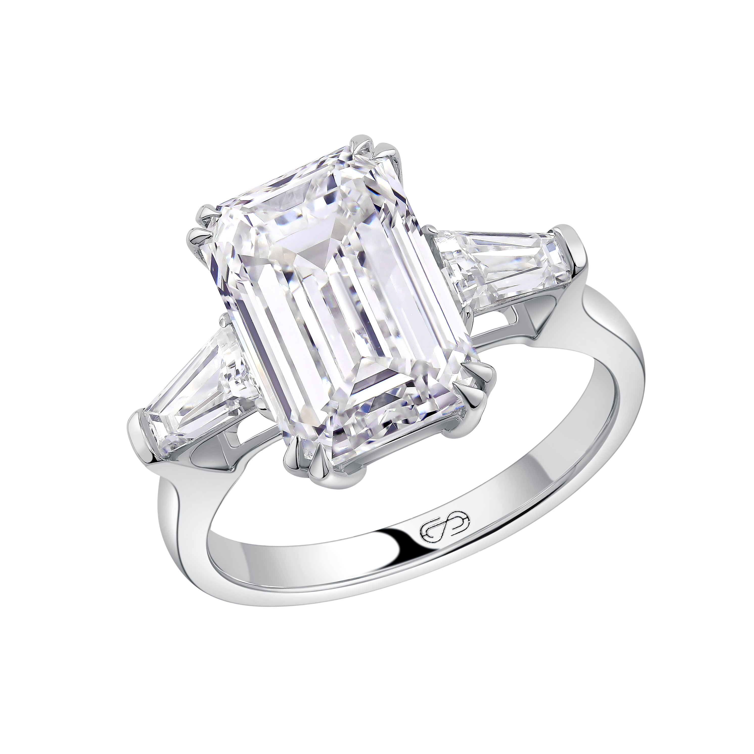 Ring Size: 7.0 Precious Metal: 18k White Gold Carat Weight Central: 5.03. Certificate: IGI Carat Weight Side Stones: 0.64 Stone: LG Diamond Diamond Color/Clarity: F+/VS1+ Stone Shape(s): Emerald Center Side Stone Shape: Fancy Baguettes Band Style: High Polish