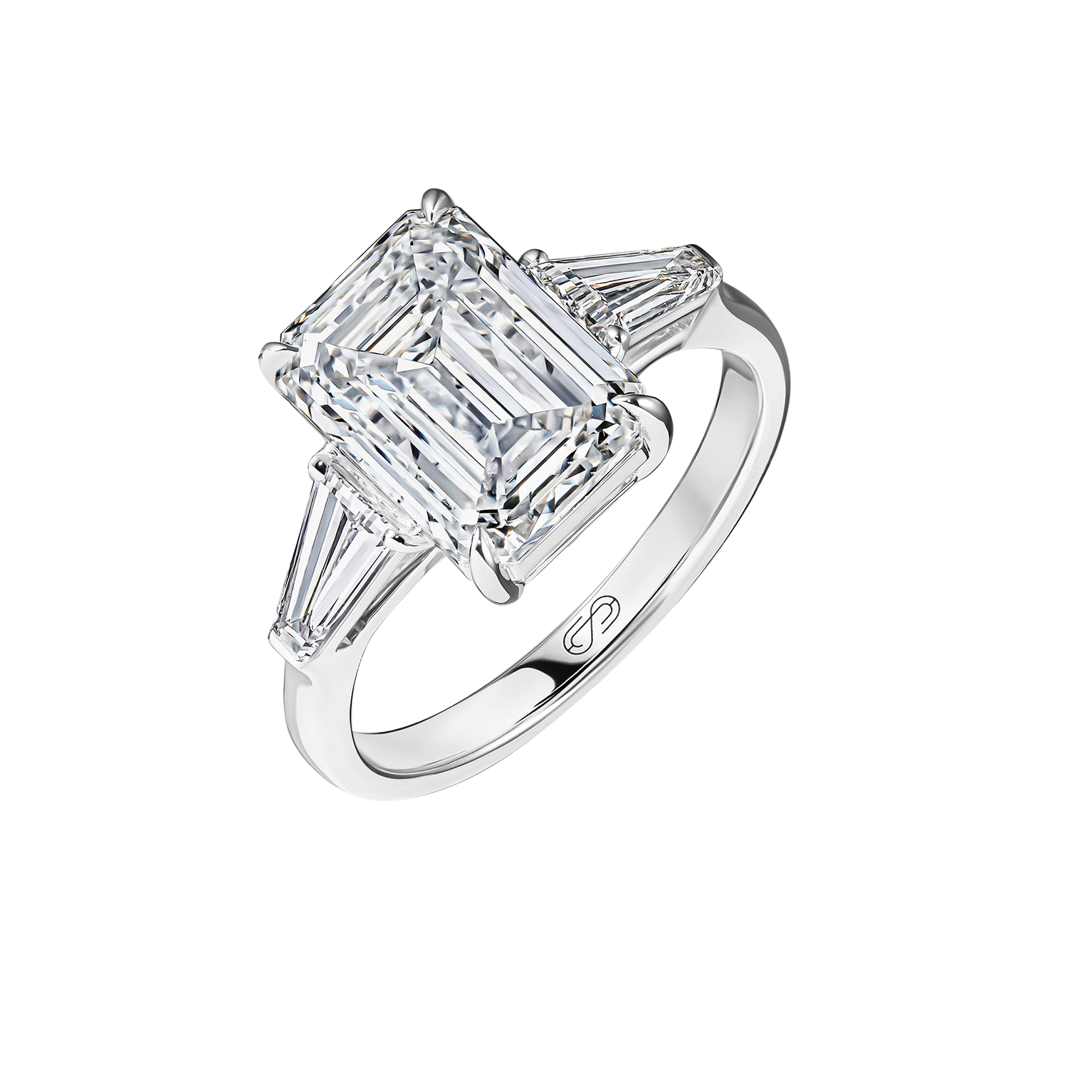 Ring Size: 8.0 Precious Metal: 18k White Gold Carat Weight Central: 5.11 Certificate IGI Carat Weight Side Stones: 1.07 Stone: LG Diamond Diamond Color/Clarity: F+/VVS2+ Stone Shape(s): Emerald Center Side Stone Shape: Baguettes Band Style: High Polish