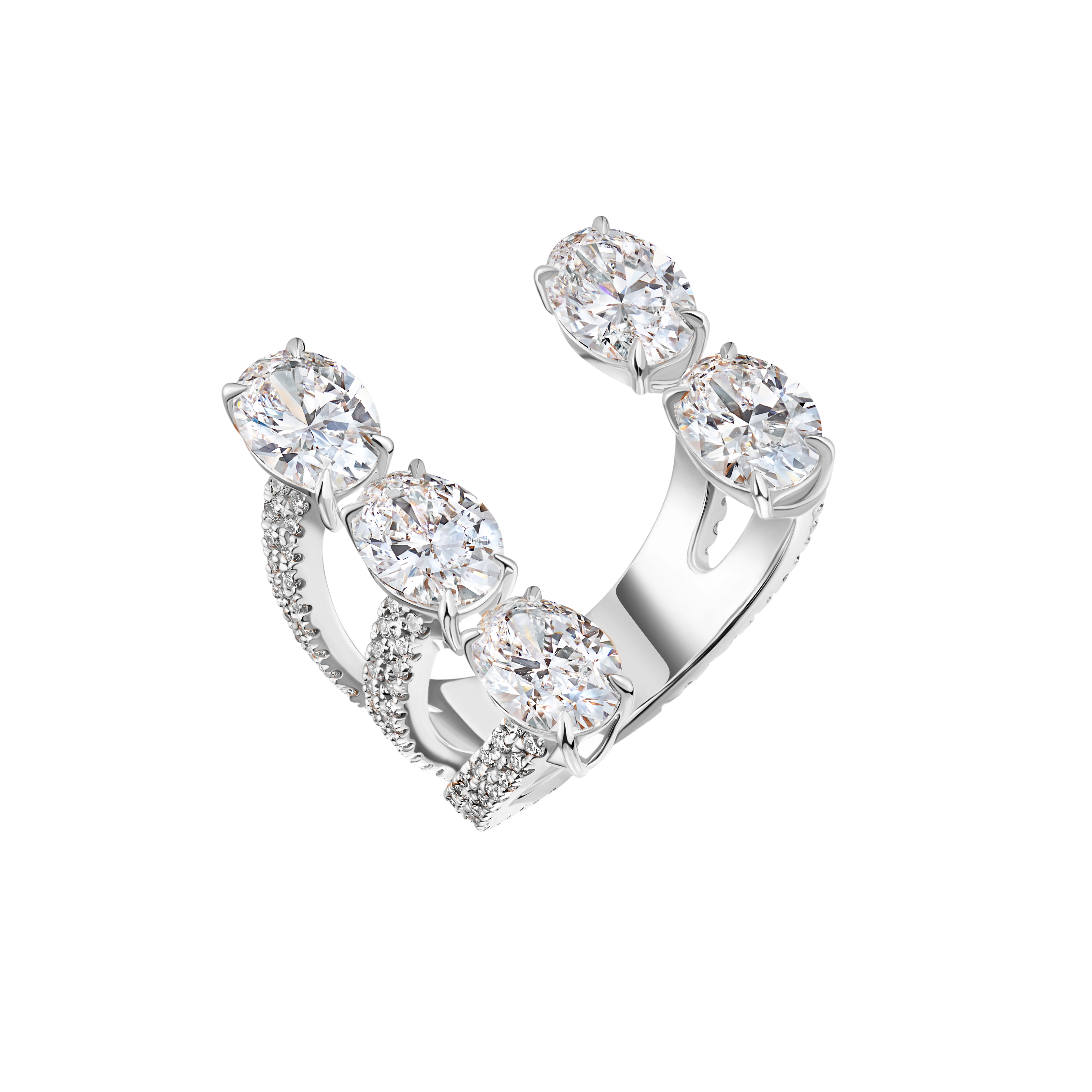 Ring Size: 3.5 Precious Metal: 18k White Gold Stone: LG Diamond Carat Total Weight: 2.543 Color/Clarity: F+/VS1+ Stone Shape(s): Oval, Round Band Style: Hug Ring, Row Eternity