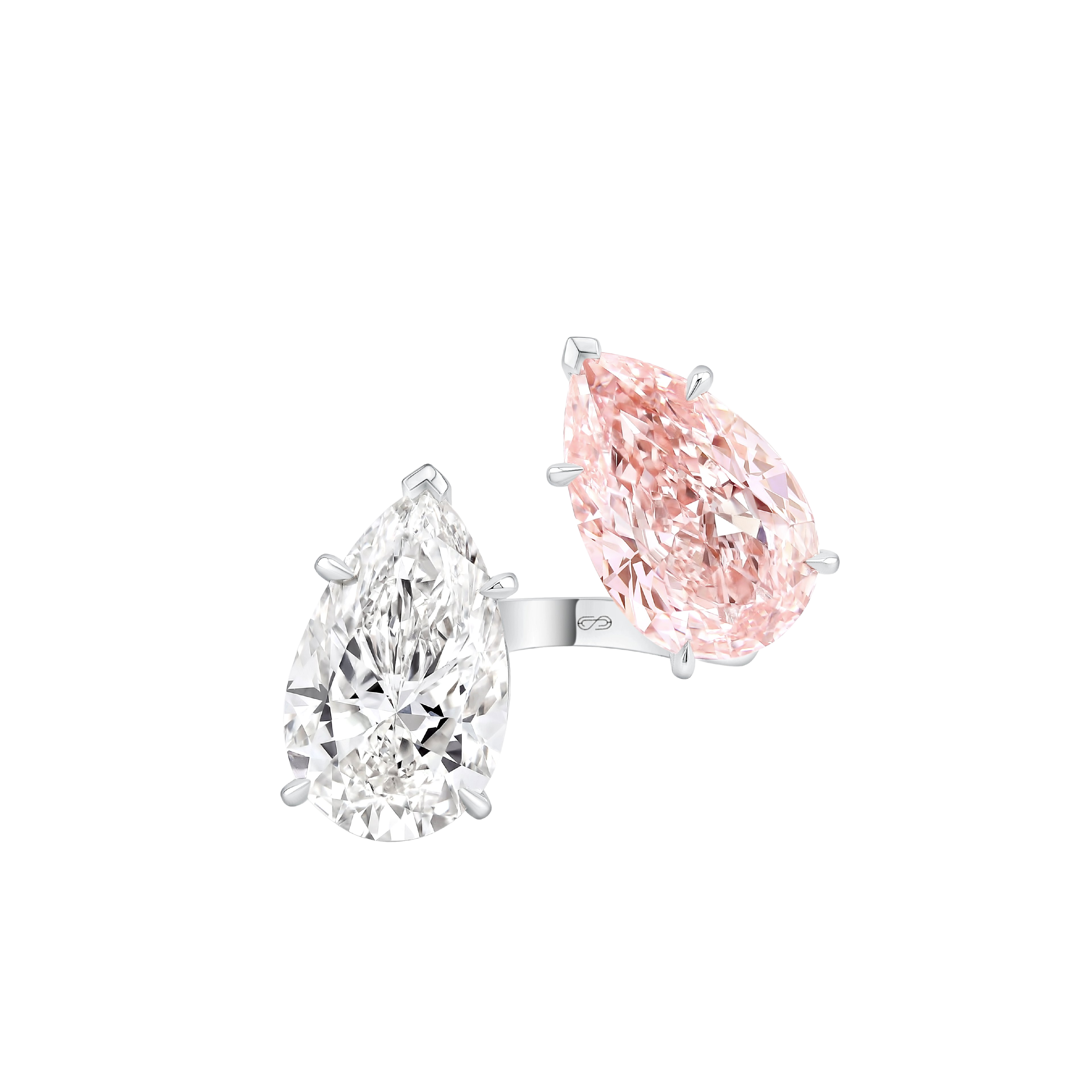 Size: 6.0 Precious Metal: 18k White Gold Stone: LG Pink Diamond Carat Total Weight: 7.13 Shape: Pear Stone: LG Diamond Carat Total Weight: 6.36 Color/Clarity: F+/ VS1+ Shape: Pear Band Style: High Polish Band