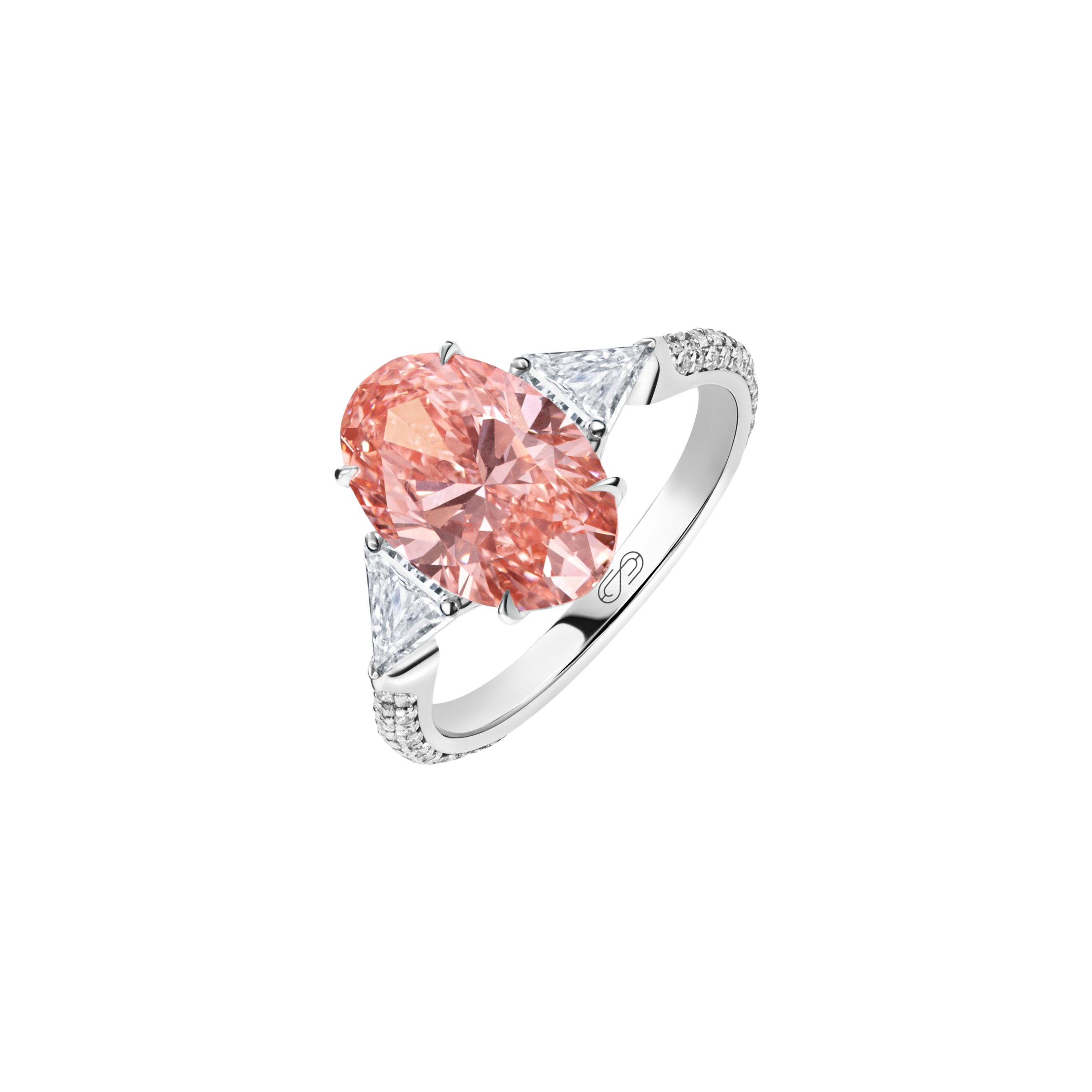 Size: 6.0 Precious Metal: 18k White Gold Stone: LG Pink Diamond Carat Total Weight: 3.02 Stone: LG Diamond Carat Total Weight: 3.882 Color/Clarity: F+/ VS1+ Shape: Oval, Triangle, Round Band Style : Half Full Eternity