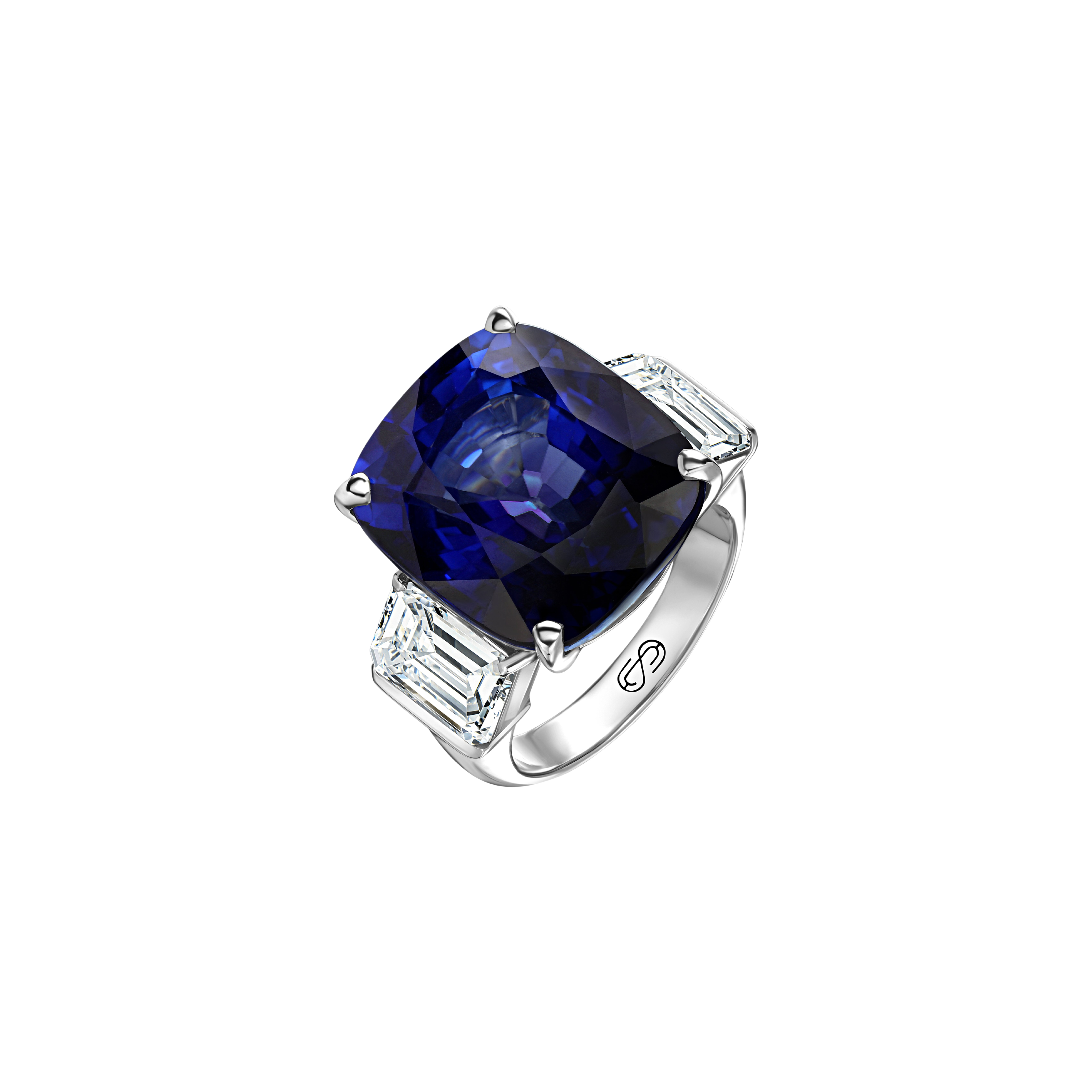 Ring Size: 5.5 Precious Metal: 18k White Gold Stone: LG Diamond Carat Total Weight: Diamond: 3.07 Color/Clarity: F+/VS1+ Stone: Recrystallized Sapphire Carat Total Weight: Sapphire:16.5 Stone Shape(s): Cushion, Emerald Band Style: High Polish Band