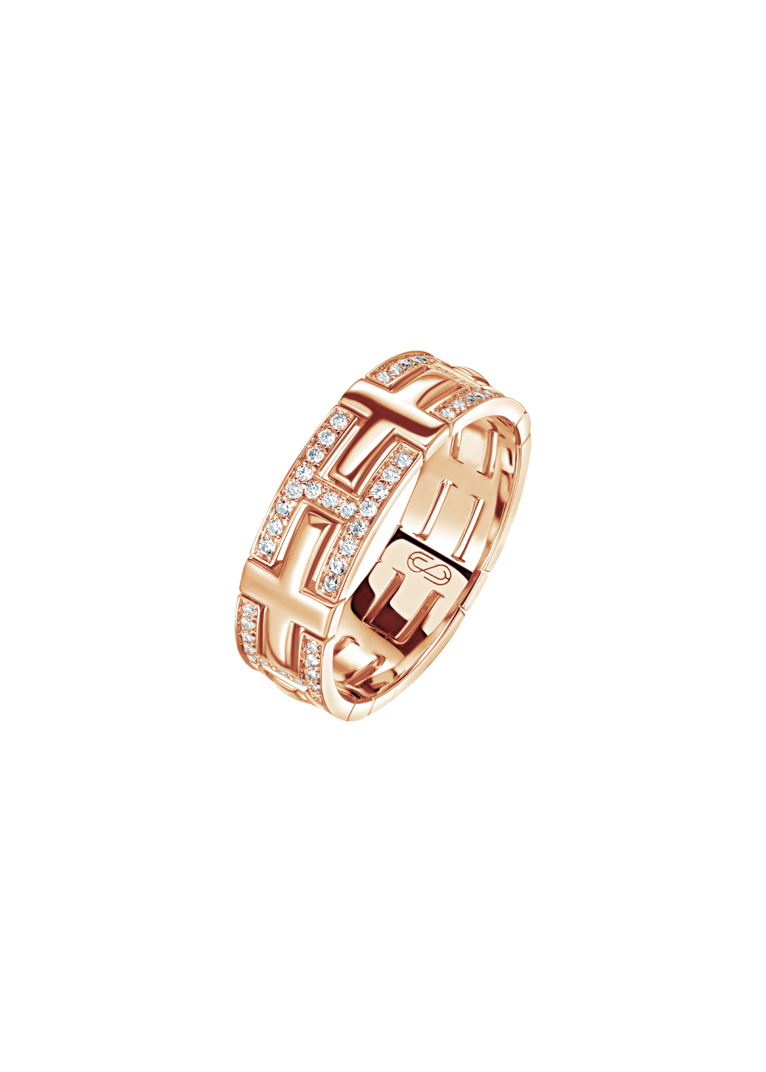 Ring Size: 6.0 Precious Metal: 18k Rose Gold Stone: LG Diamonds Carat Total Weight: 0.405 Color/Clarity: F+/VS1+ Stone Shape(s): Round Band Style: Three Chess Row Eternity